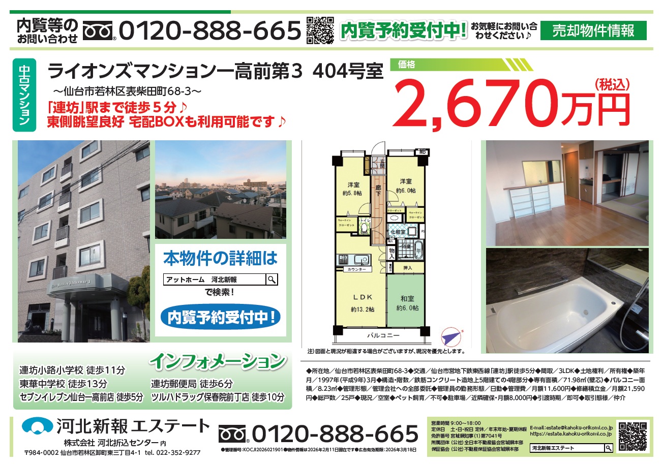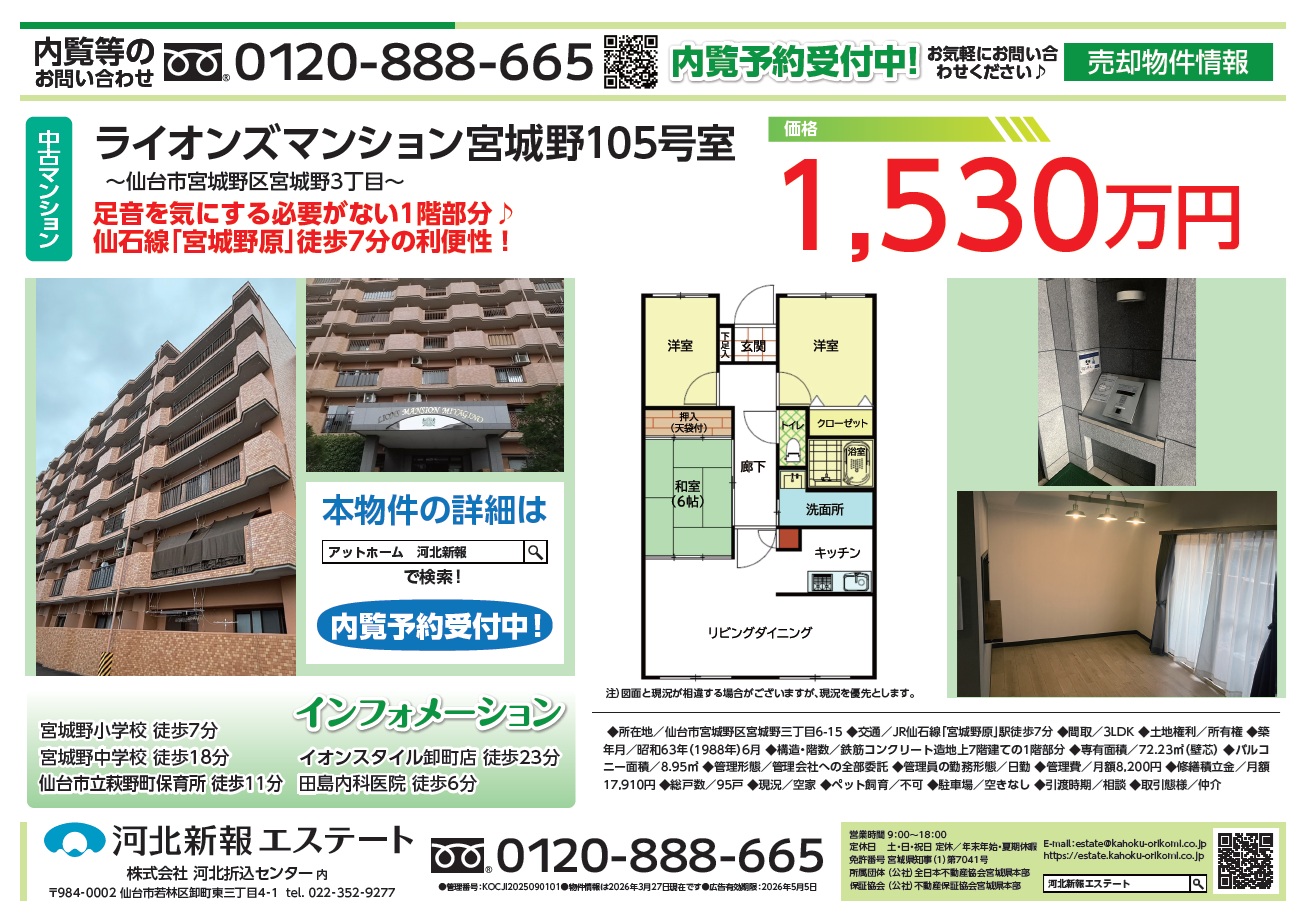 【中古マンション】宮城野区宮城野3丁目 仙石線「宮城野原」徒歩7分の3LDK♪