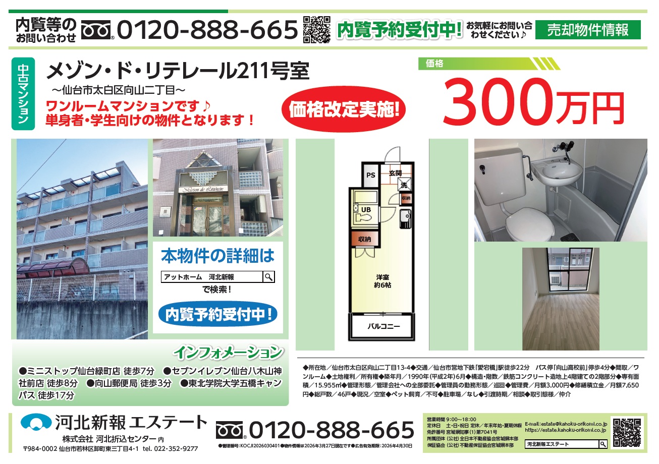 【中古マンション】価格改定実施!太白区向山二丁目 ワンルームマンション♪