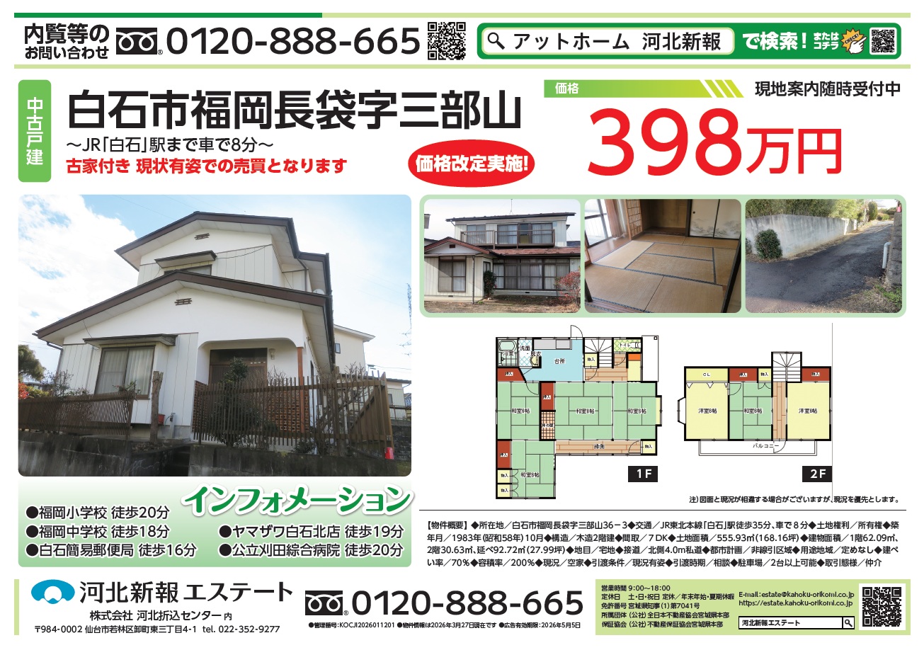 【中古戸建】価格改定実施!白石市福岡長袋字三部山
